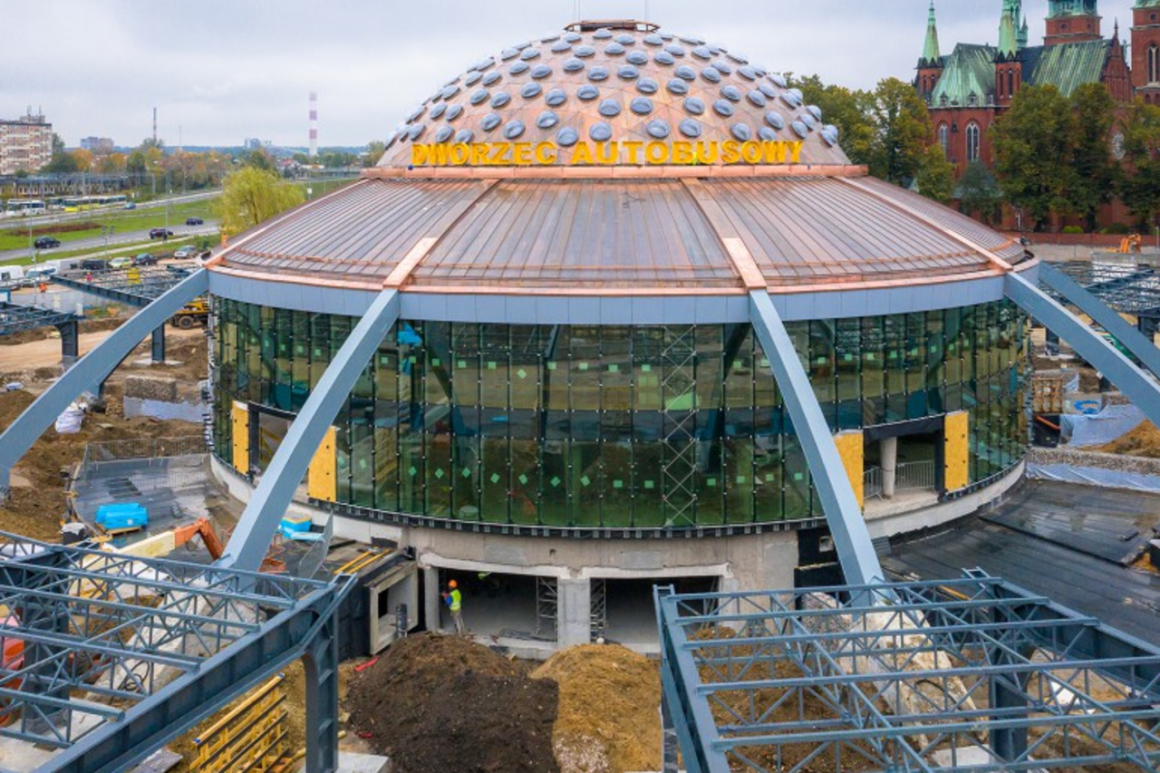 - Definitywnie zakończyliśmy etap rozbiórki. W tej chwili są też prowadzone roboty drogowe wokół budynku. Mamy częściowo wykonane krawężniki i nawierzchnie pod postój taksówek. Trwają też prace przy zbiorniku wód deszczowych. Natomiast na elewacji trwa montaż szyb fasady głównej - tłumaczy Grzegorz Tomporowski, kierownik budowy dworca. - Barwę szyb będzie można ustalać dzięki aplikacji sterowników naściennych, aplikacji w smartfonie lub czujnikami światła słonecznego. Szyby te produkowane są tylko w jednej firmie w Stanach Zjednoczonych i stamtąd do nas dotarły. Koszt jednego metra kwadratowego szyby to 6 tysięcy złotych – uzupełnia Tomporowski.