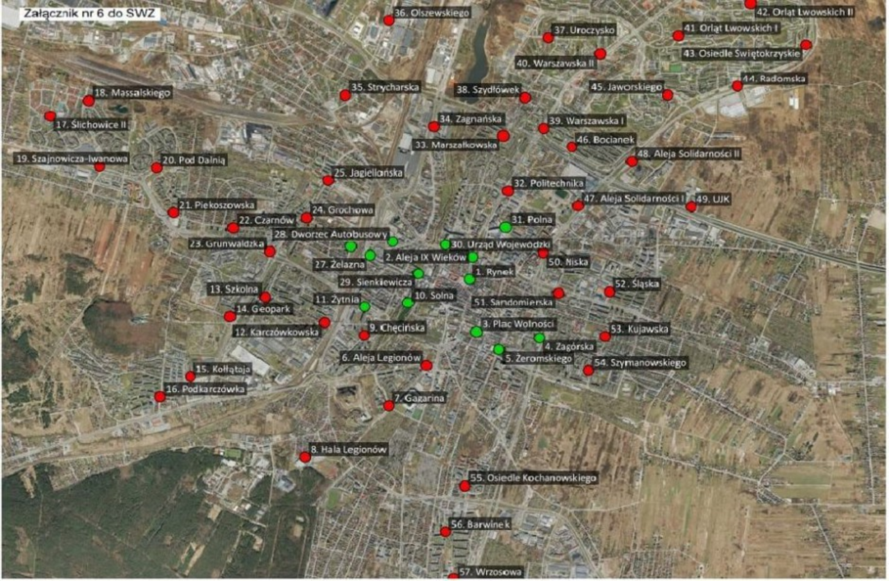 Zgodnie z informacjami zamieszczonymi na mapie, w stolicy województwa świętokrzyskiego zostanie utworzonych w sumie 57 stacji dla miejskich rowerów. Wśród lokalizacji można wymienić osiedla: Ślichowice, Pod Dalnią, Czarnów, Podkarczówkę, Barwinek, Kochanowskiego, Uroczysko, Świętokrzyskie, Szydłówek oraz Bocianek. Stacje pojawią się również przy Uniwersytecie Jana Kochanowskiego, Politechnice Świętokrzyskiej, Geoparku, Dworcu Autobusowym, Hali Legionów, Urzędzie Wojewódzkim i Urzędzie Miasta.