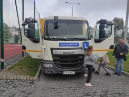 Podczas dzisiejszych zajęć, dzieciaki mają także możliwość poczuć się jak kierowca ciężarówki. W kabinie pojazdu mogą przekonać się, jaką widoczność ma osoba prowadząca takie auto.