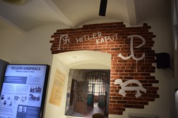 Na jednej ze ścian tego pomieszczenia znajduje się spora szafa, która po otwarciu okazuje się...drzwiami. Za nimi zobaczymy świat konspiracji, która prowadzona była w tym trudnym okresie. Znajdziemy tu rysunki z symbolami polskiego podziemia niepodległościowego, za które wielu zapłaciło życiem, ale również broń i tablice opisującą ruchy konspiracyjne. Przez bramę z krat przechodzimy do następnego obszaru tematycznego jakim jest zagłada Żydów i Polacy ich ratujący. Na ścianie widnieją nazwiska zamordowanych, zdjęcia i obszar kieleckiego getta pokazany na mapie. – Postanowiliśmy, ze nasza ekspozycja będzie narracyjnym muzeum z pewną opowieścią. Jest to potrzebne, żeby ludzie stąd pochodzących, przede wszystkim młodzi, poznali swoją ojczyznę. Nie ma patriotyzmu bez poznania miejsca, z którego się pochodzi. To misja naszego ośrodka – wyjaśnia Jolanta Białek, kierownik działu edukacji w OMPiO.