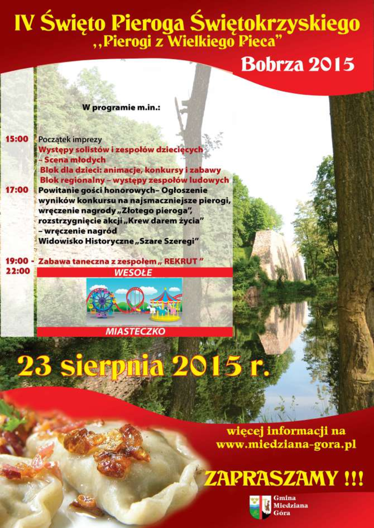 IV Święto Pieroga Świętokrzyskiego rozpocznie się o godzinie 15. Organizatorzy przygotowali moc atrakcji. Głównym punktem będzie oczywiście konkurs o laur „Złotego Pieroga”. O to zaszczytne wyróżnienie rywalizować będą zespoły z całego województwa świętokrzyskiego. Przygotowano także specjalny program dla dzieci, z wesołym miasteczkiem, konkursami i występami zespołów ludowych. Bardzo ciekawie zapowiada się widowisko historyczne „Szare Szeregi. Podczas imprezy rozstrzygnięty zostanie także akcja „Krew darem życia”.