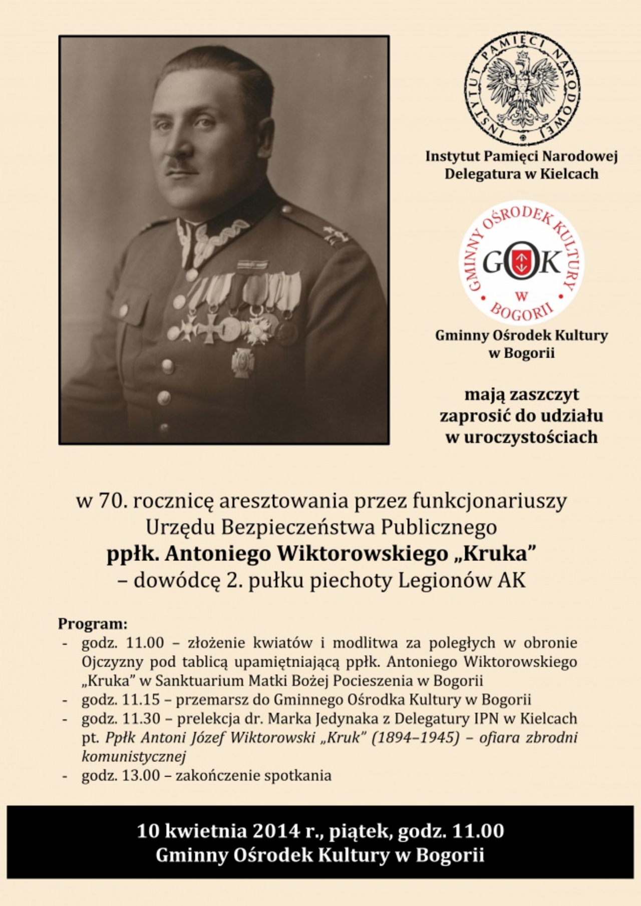 W piątek (10.04) o godzinie 11 w Sanktuarium Matki Bożej Pocieszenia w Bogorii przed tablicą upamiętniającą ppłk. Antoniego Wiktorowskiego „Kruka” odmówiona zostanie modlitwa i złożone zostaną kwiaty. Następnie uczestnicy przemaszerują do Gminnego Ośrodka Kultury, gdzie zaplanowano prelekcję.