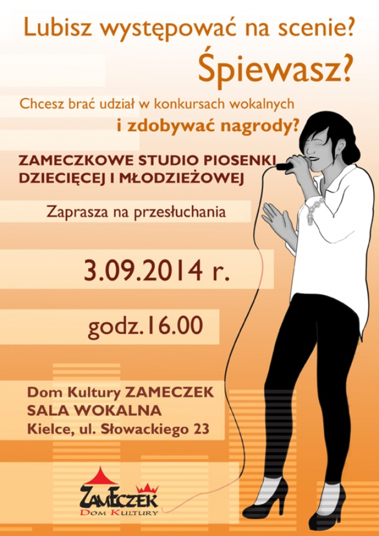 W środę (03.09) odbędą się przesłuchania dla dzieci i młodzieży do Zameczkowego Studia Piosenki. Chętni powinni zgłaszać się od godziny 16 do 20. Przesłuchania zaplanowano w Sali Wokalnej Domu Kultury „Zameczek” przy ulicy Słowackiego w Kielcach.