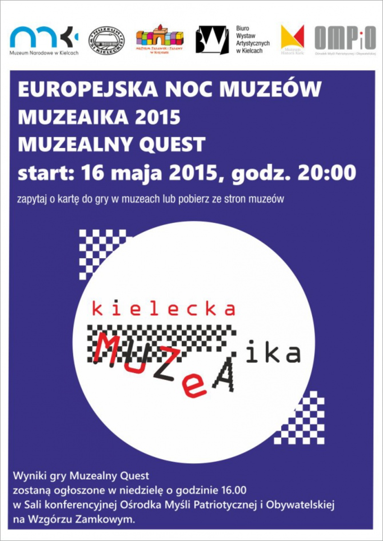 W Kielcach placówki kulturalne organizują wspólną zabawę pod nazwą Muzeaika. W wydarzeniu biorą udział Muzeum Narodowe, Muzeum Zabawek i Zabawy, Muzeum Wsi Kieleckiej, OMPIO, BWA i Muzeum Historii Kielc. Uczestnicy otrzymają zestaw questów.