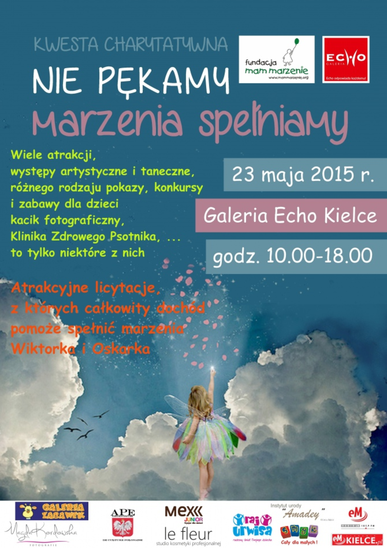 „Nie pękamy, marzenia spełniamy … bo gdy marzenia się spełniają, to choroby gdzieś znikają..choć na chwilę” - pod takim hasłem w sobotę, 23 maja, w godz. Od 10 – 18 w Galerii ECHO, Fundacja Mam Marzenie oddział Kielce, przeprowadzi akcję informacyjną połączoną ze zbiórką pieniężną.