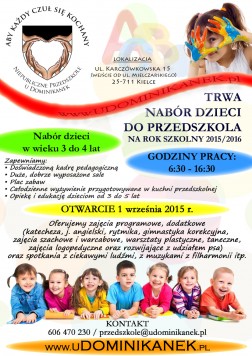 Zapisy do przedszkola będą prowadzone do wyczerpania miejsc . Szczegółowe informacje dotyczące zapisów oraz opłat znaleźć można na stronie www.udominikanek.pl