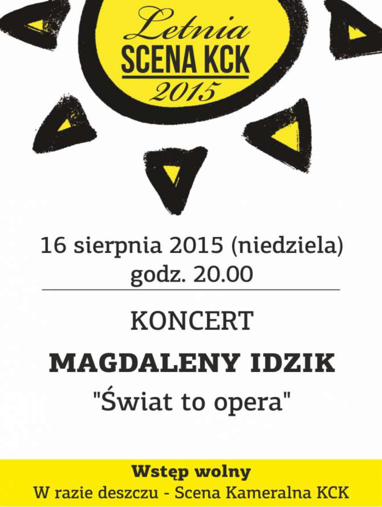 W niedzielę 16 o godzinie 20 na Scenie Letniej Kieleckiego Centrum Kultury wystąpi Magdalena Idzik z koncertem „Świat to Opera”. Śpiewaczce towarzyszyć będą Artur Jaroń i Krzysztof Błaszkiewicz.