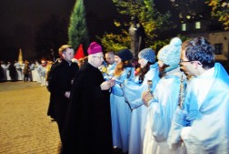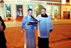 Kolejnym przystaniem w drodze procesji niosącej 44 relikwie świętych i błogosławionych był plac Jana Pawła II, gdzie uczestników przywitał biskup Kazimierz Ryczan. – Błogosław młodych, którzy byli twoją wielką pasją. Rozbudzaj w nich marzenia, pobudzaj aby patrzyli wysoko i znajdowali światło, które oświetla ścieżki życia doczesnego.