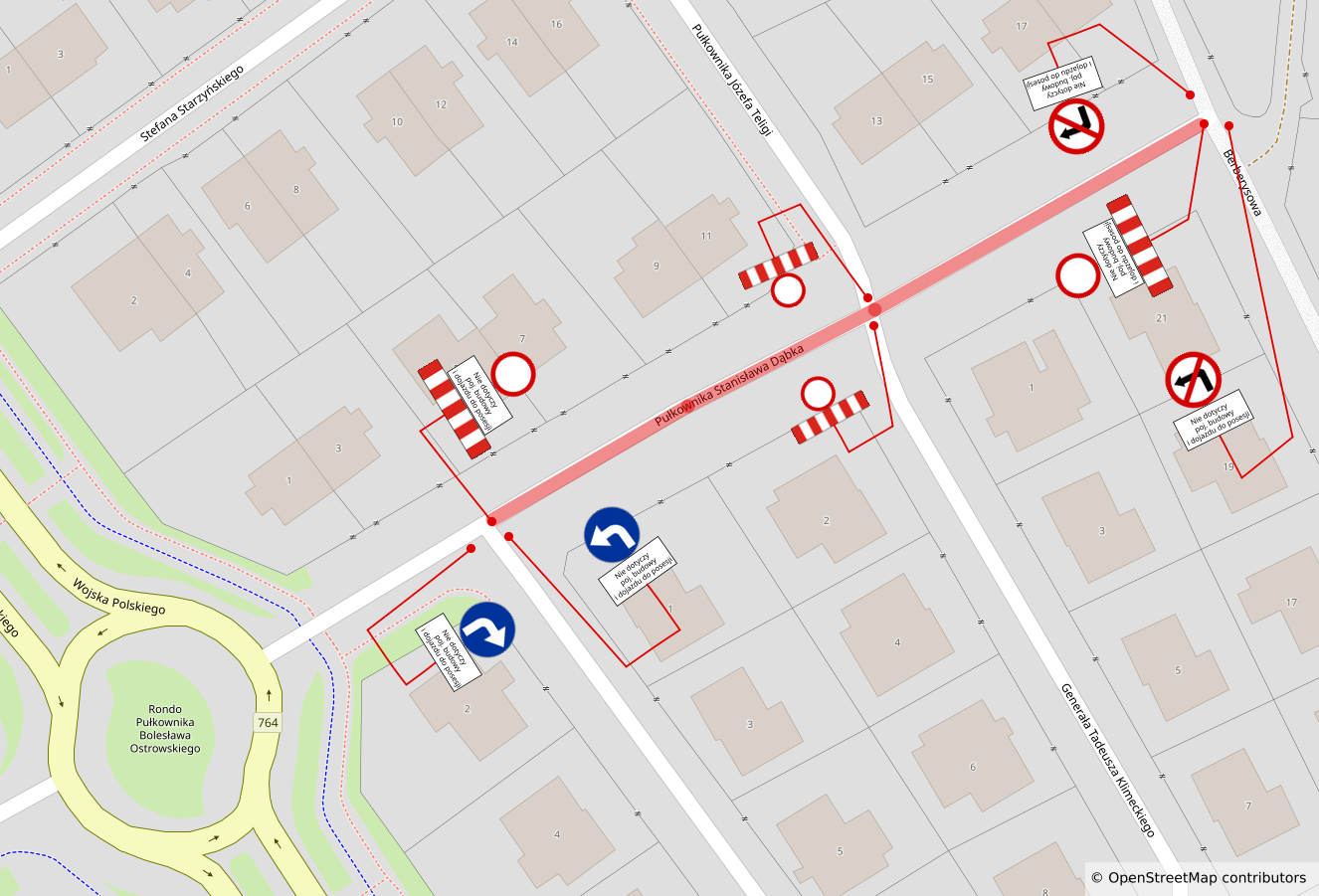 Na czas robót modernizowany fragment zostanie wyłączony z ruchu kołowego. Na teren budowy wjadą wyłącznie pojazdy wykonawcy oraz mieszkańcy dojeżdżający do swoich posesji – dojazd będzie możliwy od strony ul. Wojska Polskiego i ul. Berberysowej. Wjazdy od ulic gen. Klimeckiego i płk. Teligi zostaną całkowicie zamknięte.