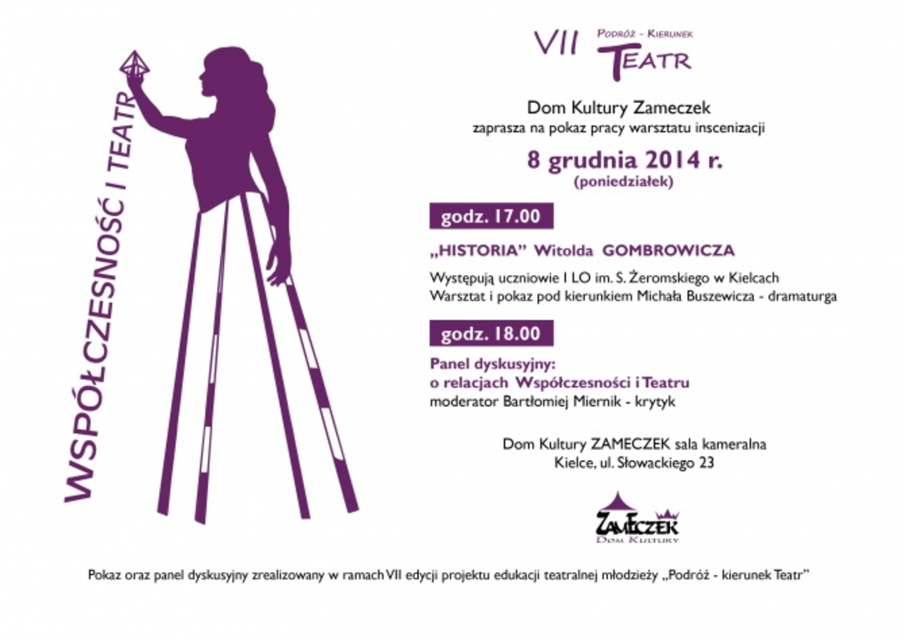 W poniedziałek (08.12) zakończona zostanie siódma edycja projektu edukacji teatralnej młodzieży „Podróż kierunek teatr”. Pokaz podsumowujący warsztaty zaplanowano o godzinie 17 w Sali Kameralnej Domu Kultury „Zameczek” w Kielcach.