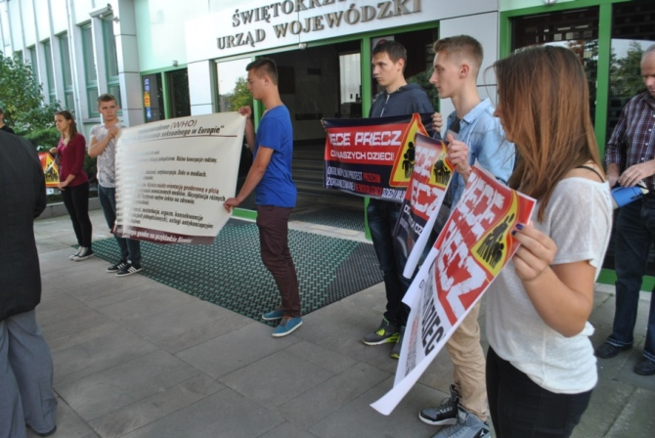 Pod Urzędem Wojewódzkim w Kielcach odbyła się pikieta sprzeciwiająca się demoralizacji dzieci i młodzieży poprzez edukację seksualną.