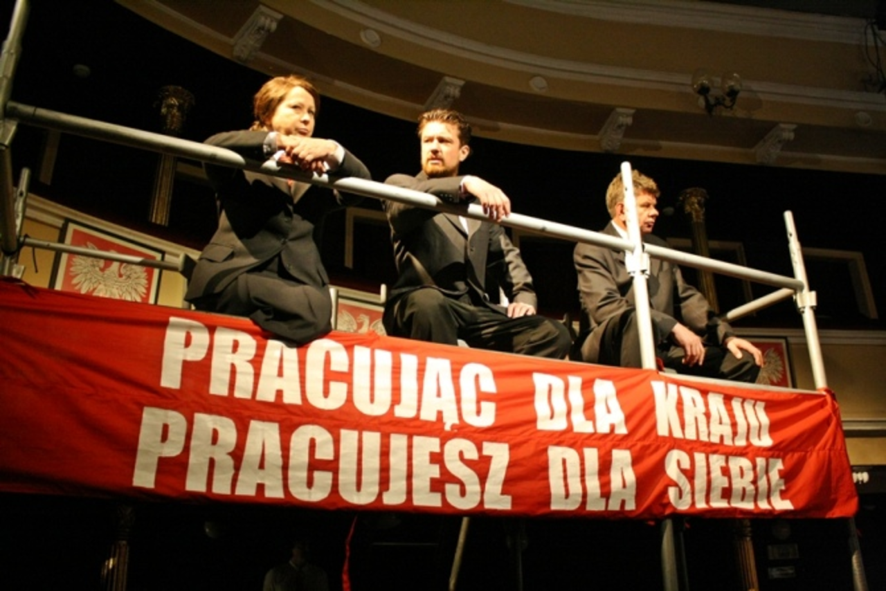Spektakl grany będzie w pięciu różnych płaszczyznach: przed teatrem, w szatni, foyer, na widowni i oczywiście na scenie. Dwie ostatnie przestrzenie będą zderzać rzeczywistość polską komunistyczną z londyńską emigracyjną. - Cieszę się, że dożyłem czasu kiedy mogę zrobić spektakl o tym, co nas dręczyło przez kilkadziesiąt lat komunizmu i spojrzeć na ten czas w sposób brutalny – zwierza się Piotr Szczerski, dyrektor teatru i reżyser spektaklu.