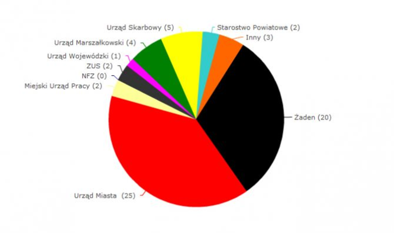 Kolejne miejsca zajęły –Urząd Skarbowy – 7,8%, Urząd Marszałkowski – 6,3%, Inny – 4,7%, Starostwo Powiatowe, ZUS, Miejski Urząd Pracy – 3,1%, Urząd Wojewódzki – 1,6%.