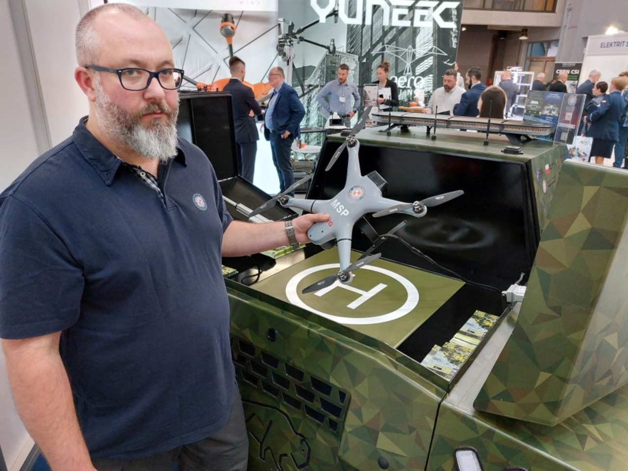 . – Jest dosyć dużych gabarytów. Porusza się na gąsienicach co ułatwia jej możliwości poruszania się w terenie trudnym – bagnistym i zalesionym. Może być zastosowana przy monitorowaniu dróg i granic, ale także w akcjach poszukiwawczych, czy podczas klęsk żywiołowych. W bagażniku mamy bezzałogowy statek powietrzny – mówił Radiu eM Kielce Michał Wąsiewicz z Instytutu Technicznego Wojsk Lotniczych.