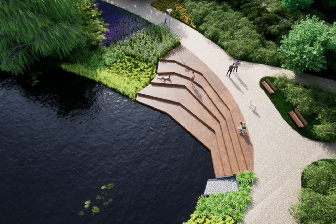 Inwestycja stawia na retencję i mądre zarządzanie wodą. Powstaną ogrody deszczowe oraz instalacja nawadniająca, wykorzystująca wodę opadową ze stawu do podlewania roślin oraz zmywania powierzchni utwardzonych. Dzięki wymianie nawierzchni na mineralno-żywiczne, czyli przepuszczalne, woda zamiast spływać do kanalizacji będzie swobodnie wsiąkać w grunt. Projekt zakłada również remont schodów, wymianę ławek i koszy oraz modernizację fontanny.