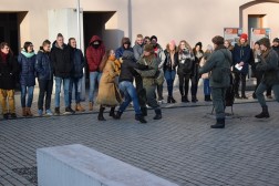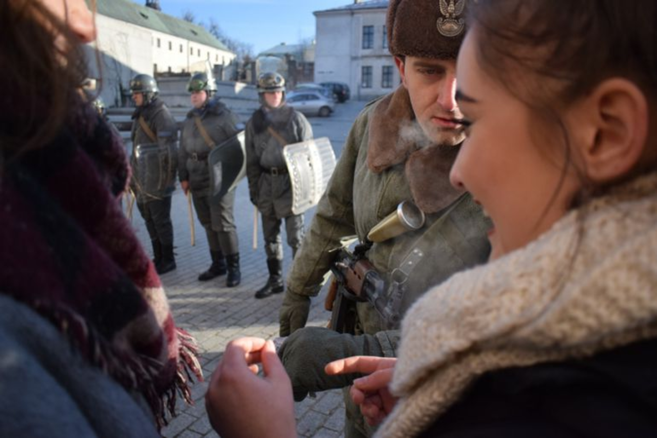 Uczniowie nie od razu mogli dostać się do sal warsztatowych w OMPIO. Nieoczekiwanie musieli najpierw wylegitymować się osobom odgrywającym role milicjantów i odebrać przepustki. Taką scenkę zaaranżował klub historyczny działający przy I LO im. Stefana Żeromskiego. - Mnie stan wojenny w podobny sposób zaskoczył. Zostałem przywieziony z kursu instruktorów harcerskich i kiedy wysiadłem z samochodu dokładnie taka scena się odbyła. Ustawiono nas w dwuszeregu, poinformowano, że wprowadzono stan wojenny, obowiązuje godzina milicyjna, nie działają telefony - mówił Zbigniew Kowalski, opiekun młodzieżowej grupy rekonstruktorów.