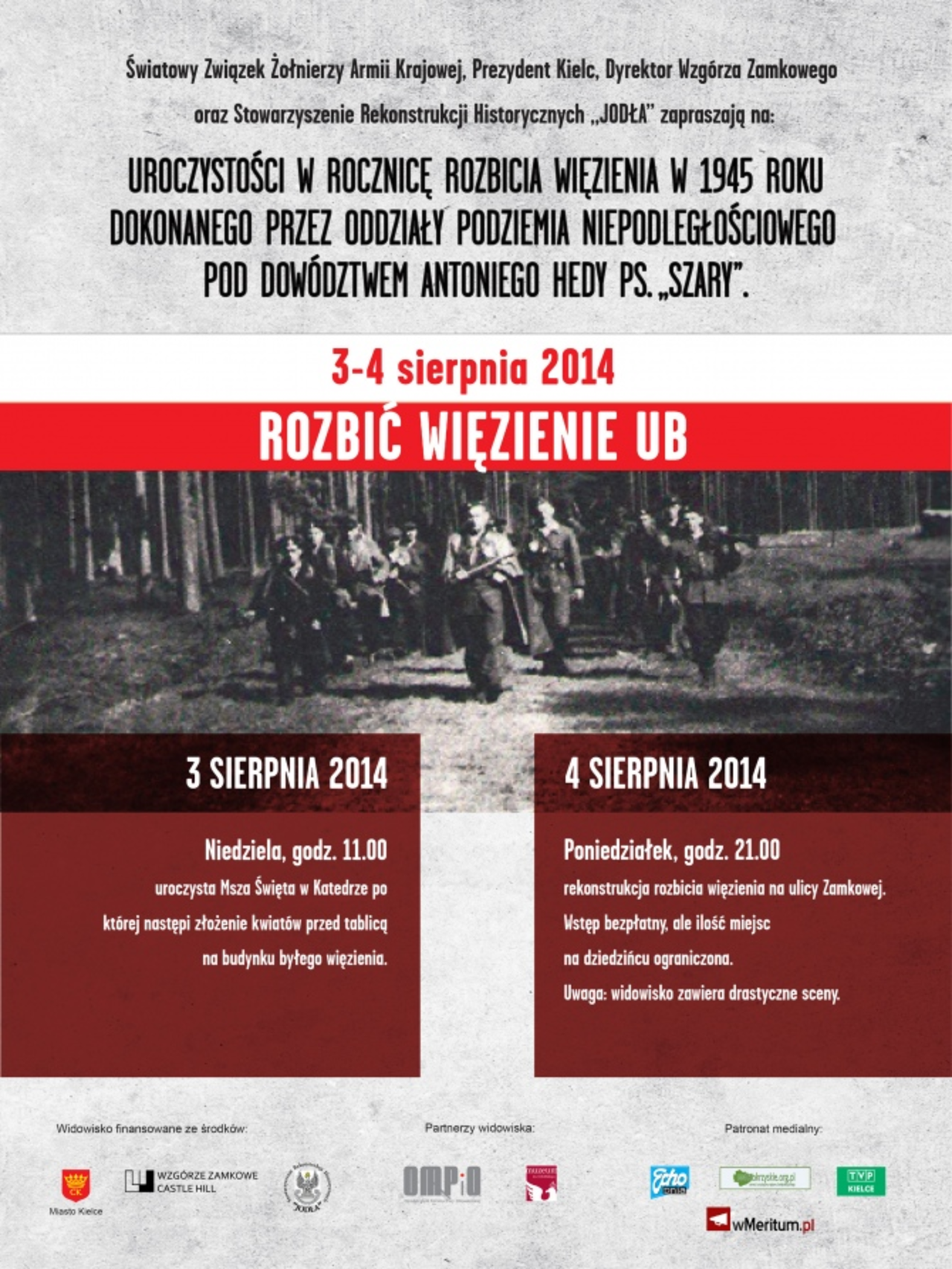 Rekonstrukcja opanowania więzienia odbędzie się 4 sierpnia 2014r. (historyczna data). Początek o godzinie 21 na dziedzińcu Wzgórza Zamkowego w Kielcach. Tegoroczne widowisko będzie miało wyjątkowy charakter bowiem będzie połączeniem rekonstrukcji i spektaklu teatralnego. Przedstawimy historię osób związanych z opisywanymi wydarzeniami od lata 1944r. Opowiemy o śmierci ludzi, których jedyną winą było to że chcieli Polski Wolnej i Niepodległej. Opowiemy ostatecznie o samej akcji zbrojnej. Historia osób osadzonych w więzieniu jest tragiczna i straszne są ich przeżycia. Opowieść będzie zawierała treści drastyczne dlatego prosimy widzów o zrozumienie. W widowisku weźmie udział około 50 osób, nie zabraknie broni oraz wybuchów. Tegoroczne widowisko odbędzie się na dziedzińcu dawnego więzienia, gdzie ilość miejsc jest ograniczona, ale wstęp dla wszystkich chętnych jest oczywiście wolny.
