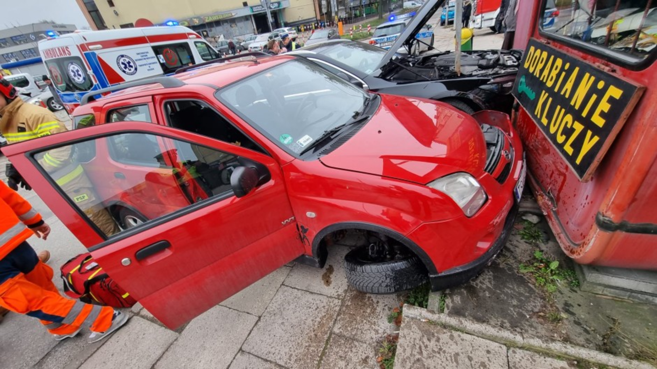 W wyniku uderzenia, suzuki zostało zepchnięte i uderzyło w kiosk. 72-latka trafiła do szpitala. Na miejscu wciąż mogą być utrudnienia.