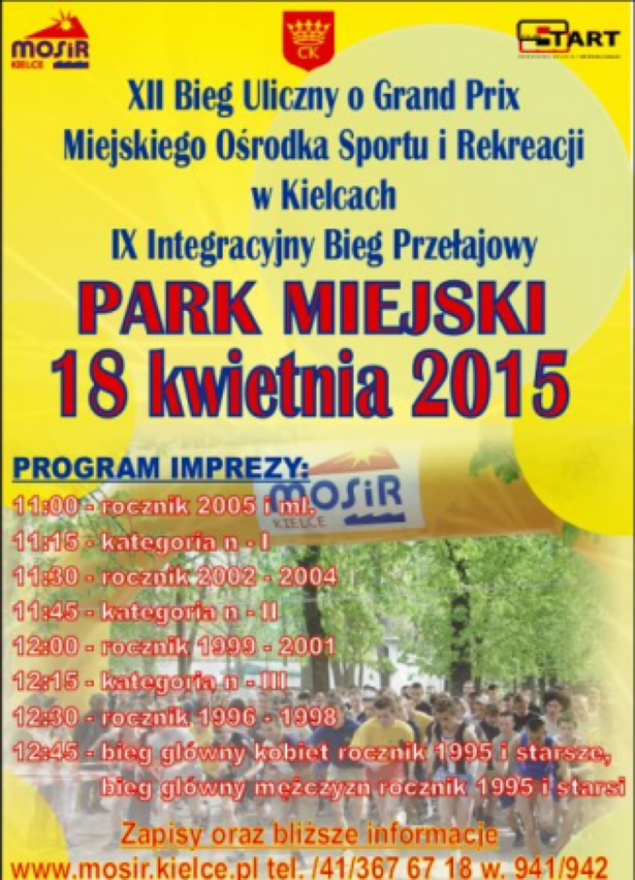 Miejski Ośrodek Sportu i Rekreacji oraz Zrzeszenie Startu i Rehabilitacji "Start" Kielce zapraszają 18.04.2015 r. o godz. 11:00 do Parku Miejskiego. Odbędzie się tam XII Bieg o Grand Prix MOSiR w Kielcach i IX Integracyjny Bieg Przełajowy.