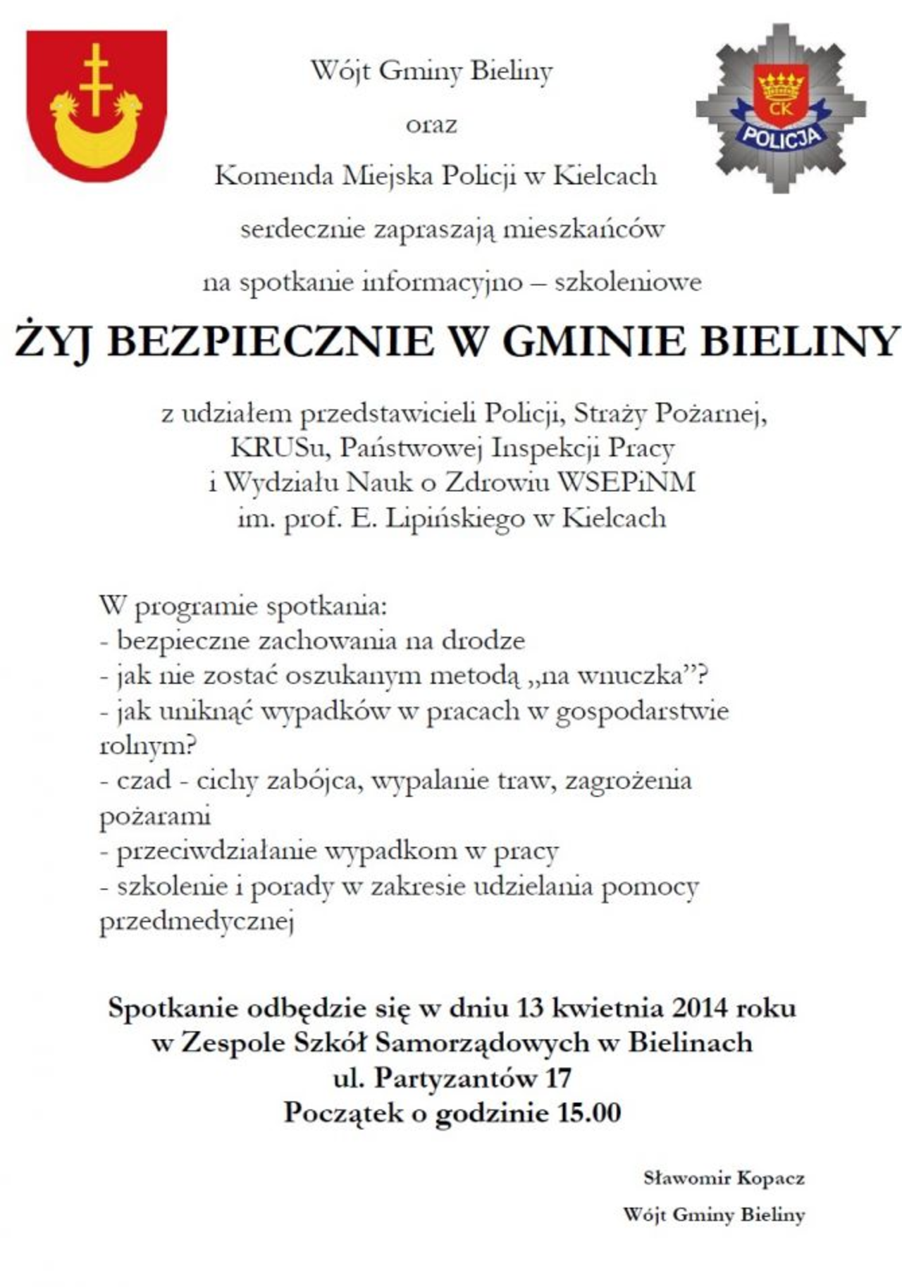 Wójt Gminy Bieliny oraz Komenda Miejska Policji w Kielcach serdecznie zapraszają mieszkańców na spotkanie informacyjno – szkoleniowe ŻYJ BEZPIECZNIE W GMINIE BIELINY. Odbędzie się ono z udziałem przedstawicieli Policji, Straży Pożarnej, KRUSu, Państwowej Inspekcji Pracy i Wydziału Nauk o Zdrowiu WSEPiNM im. prof. E. Lipińskiego w Kielcach.