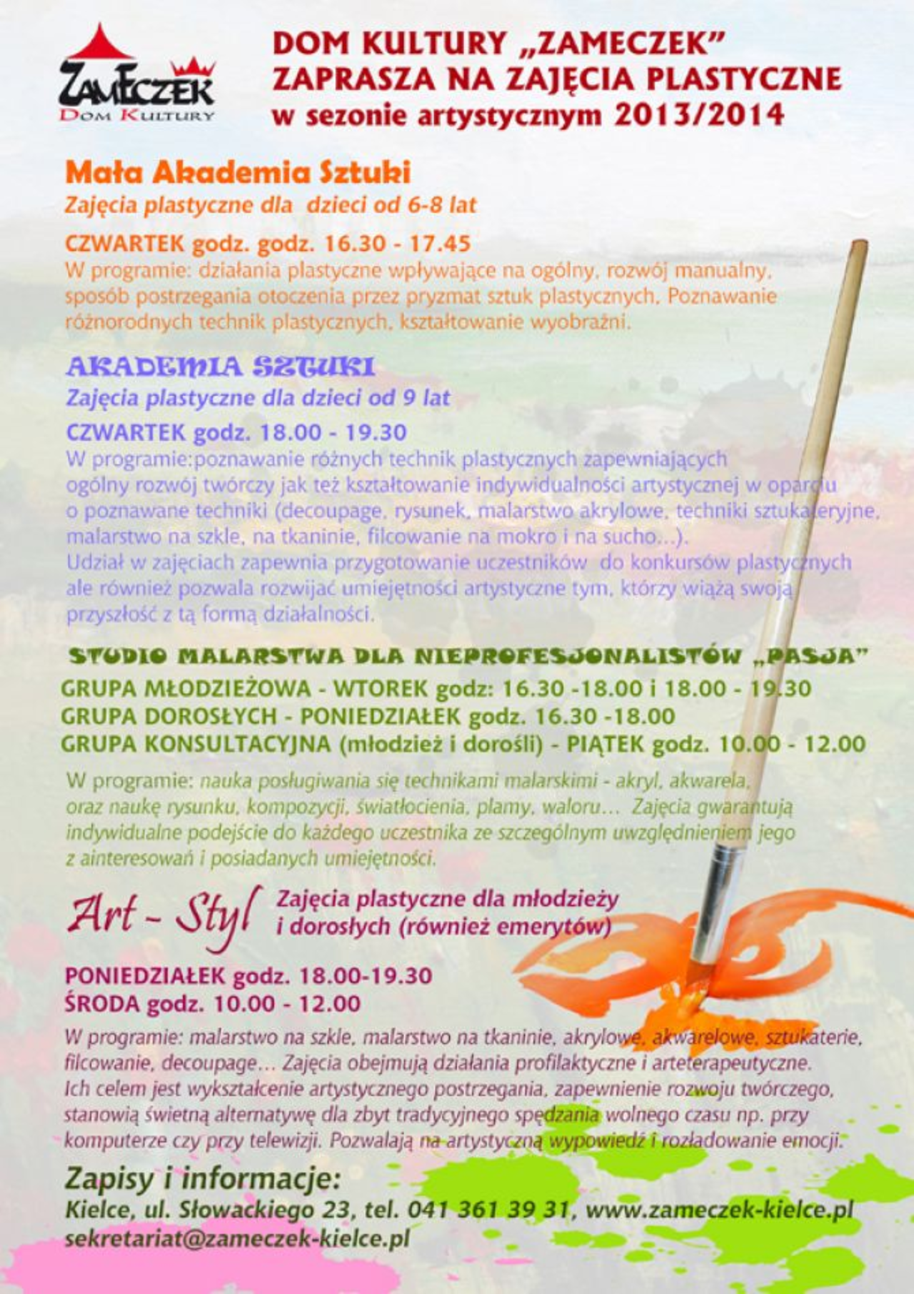 Dom Kultury Zameczek zaprasza w nowym sezonie artystycznym 2013/2014, dzieci, młodzież i dorosłych do rozwijania pasji w dziedzinach rysunku, malarstwa, malarstwa witrażowego, malarstwa na tkaninie, filcowania, decoupage, tworzenia biżuterii z sutaszu oraz innych sztukach dekoracyjnych.
