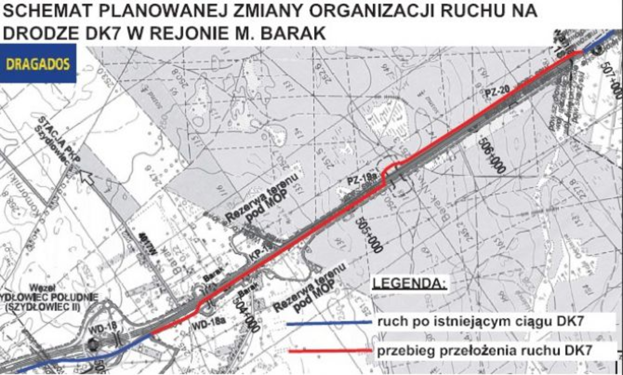 - Ruch przełożony zostanie z istniejącej drogi krajowej nr 7 na fragment nowej jezdni przyszłej drogi ekspresowej S7 oraz fragment nowej dojazdowej na odcinku o łącznej długości 3 km począwszy od budowanego węzła Szydłowiec Południe do granicy województw świętokrzyskiego i mazowieckiego. Zmiana organizacji ruchu jest konieczna ze względu na kontynuację robót bitumicznych na ciągu głównym budowanej drogi ekspresowej. Zmiana organizacji ruchu wprowadzana będzie etapami od południa do późnych godzin nocnych – poinformowała Małgorzata Pawelec rzecznik GDDKiA w Kielcach.