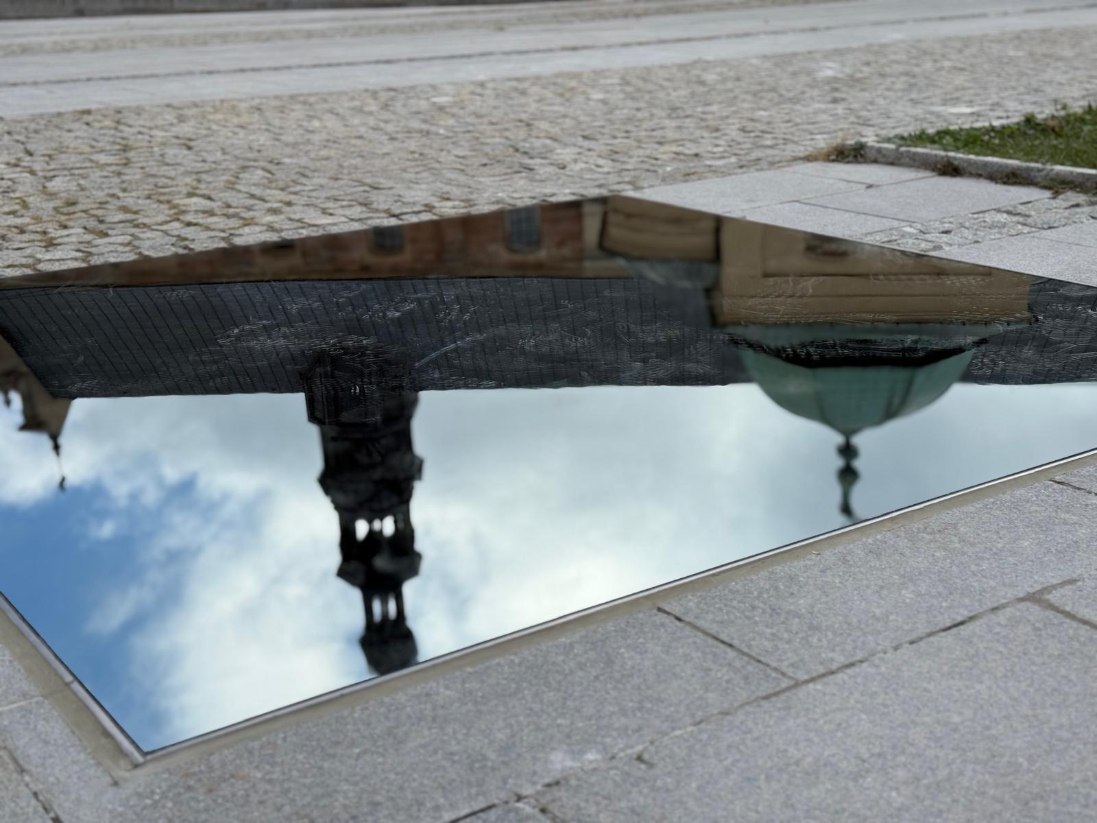 Jak czytamy w opisie instalacji autorstwa Marka Cecuły: „Szklana tafla o wymiarach 2 m x 2 m z powłoką lustrzaną została osadzona w powierzchni chodnika, integrując się z otoczeniem i tworząc w płaszczyźnie placu efekt ruchomego obrazu”.