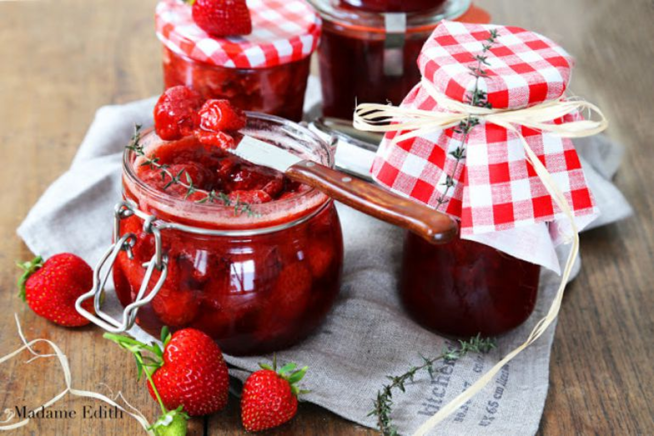 Oczywiście można przygotować również tradycyjne dżemy z różnych owoców, takich jak truskawki, śliwki, aronie, czy porzeczki. Wystarczy zasypać je cukrem, przesmażyć, włożyć do słoików i zapasteryzować. Gospodyni podkreśla, że porzeczki doskonale nadają się do przetwarzania, ponieważ zawierają duże ilości pektyny, która powoduje, że po ostudzeniu konfitury bardzo dobrze gęstnieją i nie trzeba do nich dodawać żadnych żelfixów, a jedynie trochę cukru.