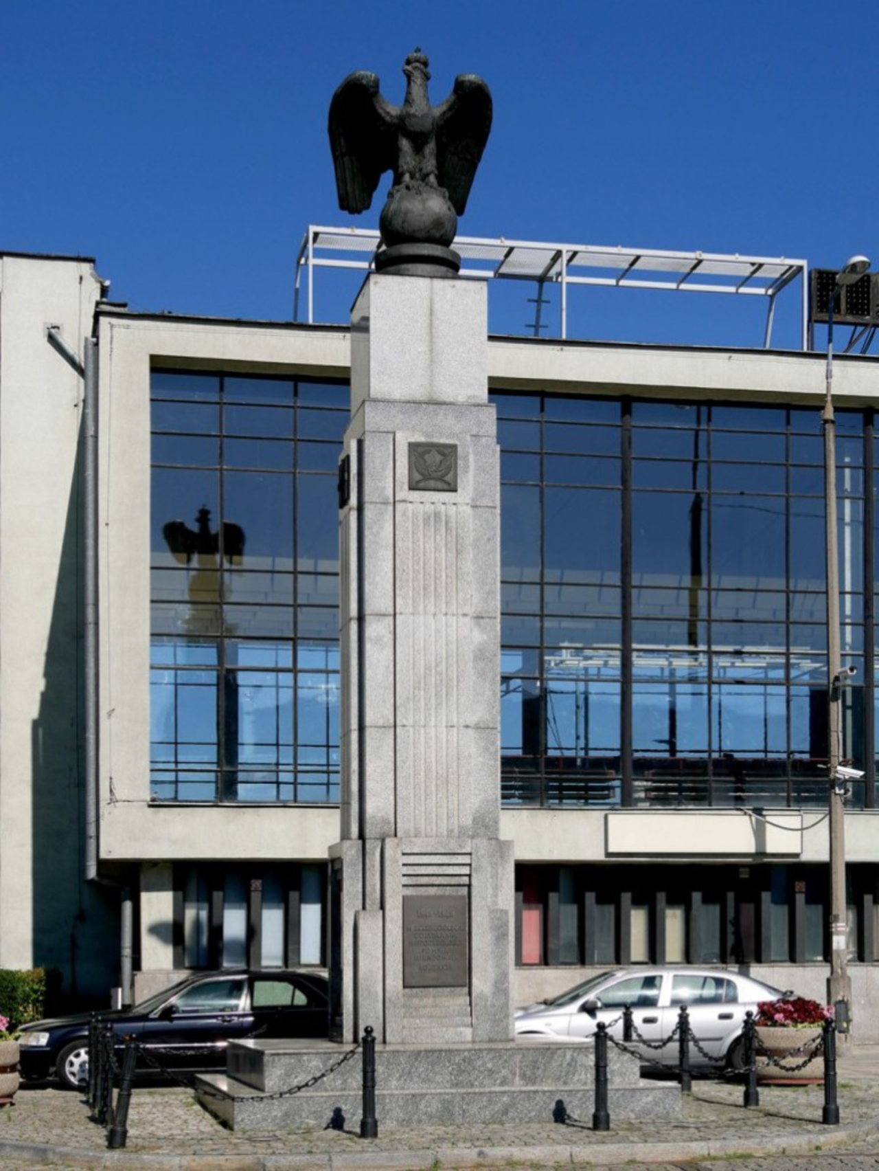 Niewielu z nas pamięta, że stoi on w miejscu pierwszej potyczki strzelców marszałka Józefa Piłsudskiego z Rosjanami, 12 sierpnia 1914 roku. Przed dworcem kolejowym, na wysokim kamiennym cokole pręży się potężny orzeł z zerwanymi kajdanami. Mocne szpony opiera na kuli – to świat cały. A rozerwane więzy pozwolą mu wzlecieć ku wolności. Wolności od zaborów i… komuny, bo dopiero kiedy ona przestała istnieć, możliwa była odbudowa monumentu.