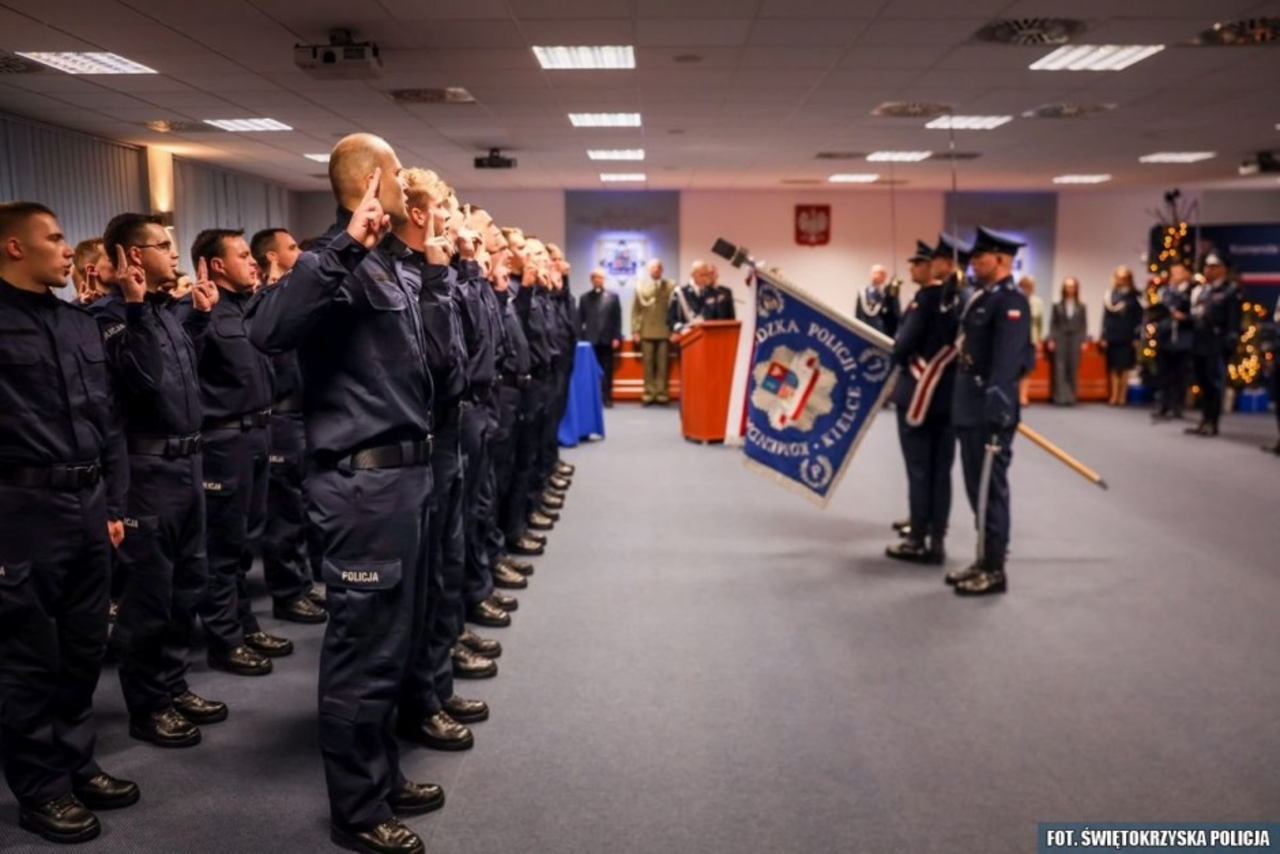 48 funkcjonariuszy wypowiedziało dziś (4 stycznia) słowa roty ślubowania w Komendzie Wojewódzkiej Policji w Kielcach. Nowi policjanci już wkrótce zasilą świętokrzyski garnizon. Choć przed nimi wiele wyzwań, to z entuzjazmem podchodzą do codziennej służby.