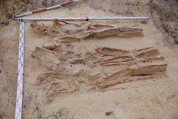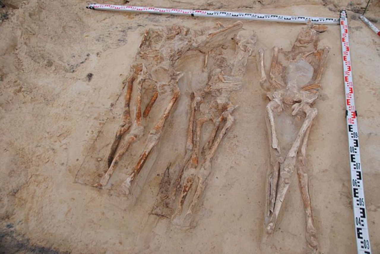 Znalezione szkielety ułożone były w dwóch warstwach. Szczątki 6 osób należały prawdopodobnie do postawnych mężczyzn i pochowane były w bardzo prostych trumnach, których zarys dało się dostrzec wokół szkieletów. Nie znaleziono przy nich żadnych przedmiotów, takich jak guziki, przedmioty osobiste czy fragmenty ubrań.