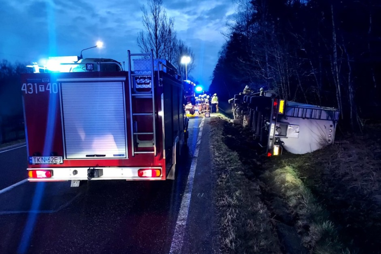 Jak informuje mł. bryg. Mariusz Czapelski z KP PSP w Końskich, pojazd przewrócił się na bok do przydrożnego rowu.