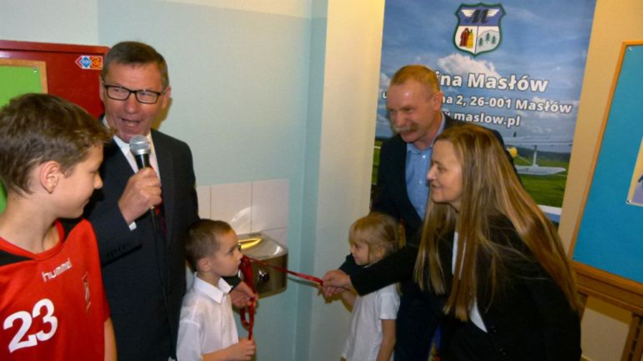 Uczniowie Zespołu Szkół im. Jana Pawła II w Masłowie mogą od dziś korzystać z poidełka. To pierwsze takie urządzenie w tamtejszej gminie.