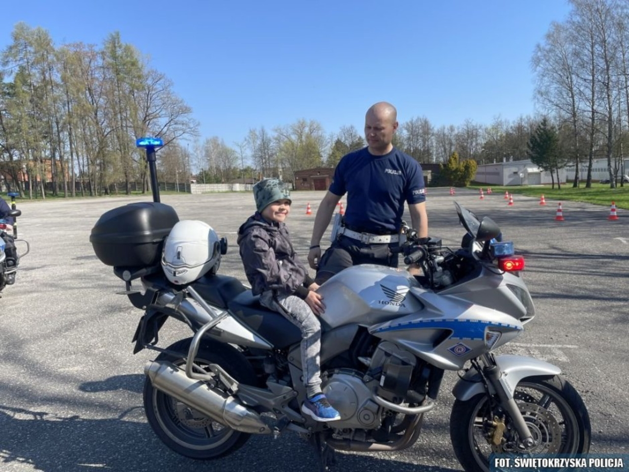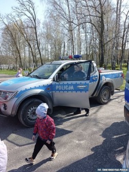 Dzisiejsza wizyta rozpoczęła się od pokazu tresury psa służbowego. Przewodnik psa policyjnego zaprezentował posłuszeństwo czworonoga i omówił jak bezpiecznie zachować się w kontakcie z psem. Przedszkolaki oglądały także policyjne radiowozy i motocykle, zarówno te które poruszają się po ulicach naszego regionu jak i te wykorzystywane w szczególnych warunkach.