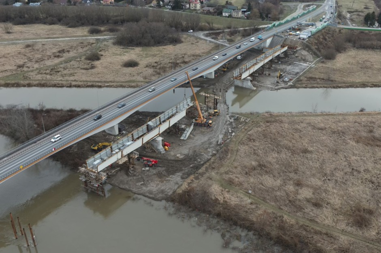 Przypomnijmy, że most znajduje się w ciągu drogi krajowej nr 77. Montaż prowadzony jest na dwa sposoby – tradycyjny, z użyciem dźwigu oraz poprzez nasuwanie zmontowanej konstrukcji na podpory.