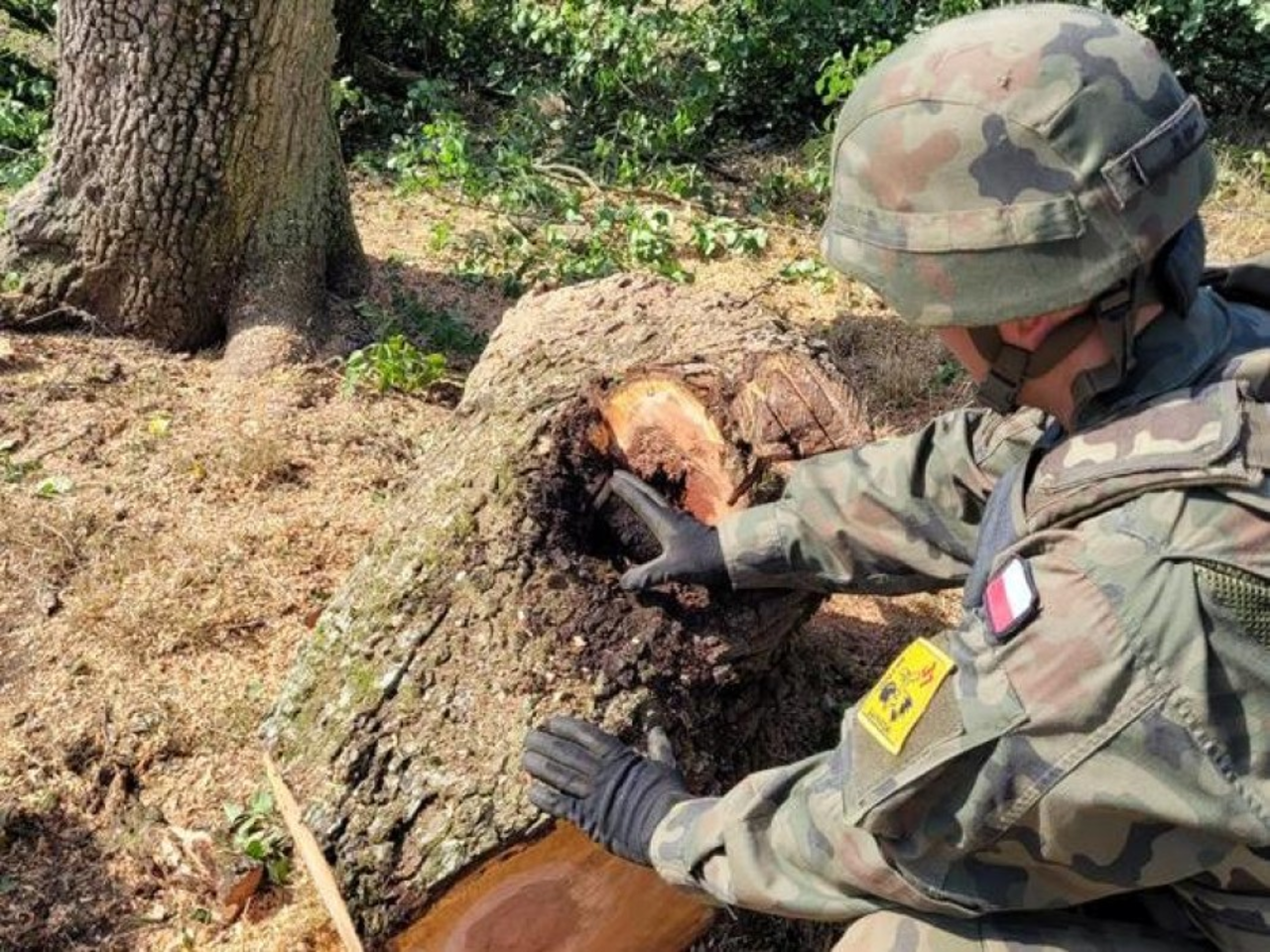 Pocisk kaliber 57 milimetrów saperzy odnaleźli w pniu drzewa na terenie prywatnej posesji. Dowódca patrolu podjął decyzję o wycięciu drzewa.