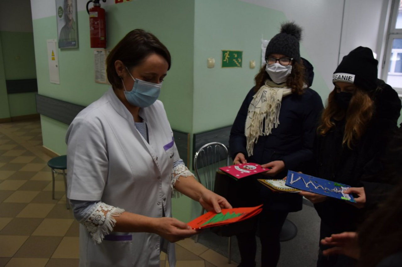 - Ten rok jest dla wszystkich, a zwłaszcza lekarzy i pielęgniarek, bardzo trudny. Wykorzystaliśmy piękną tradycję wręczania kartek, by w ten sposób przekazać medykom najlepsze życzenia oraz podziękować za ich dotychczasową pracę - mówiła Edyta Ślusarczyk, edukator z OEM „Świętokrzyski Sztetl”.