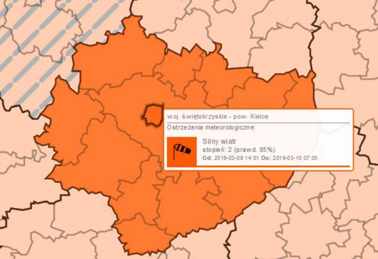Ostrzeżenie drugiego stopnia dla całego naszego województwa w związku z silnym wiatrem wydał Instytut Meteorologii i Gospodarki Wodnej. Specjalny Alert poprzez wiadomość SMS wysłało do mieszkańców województwa świętokrzyskiego Rządowe Centrum Bezpieczeństwa.