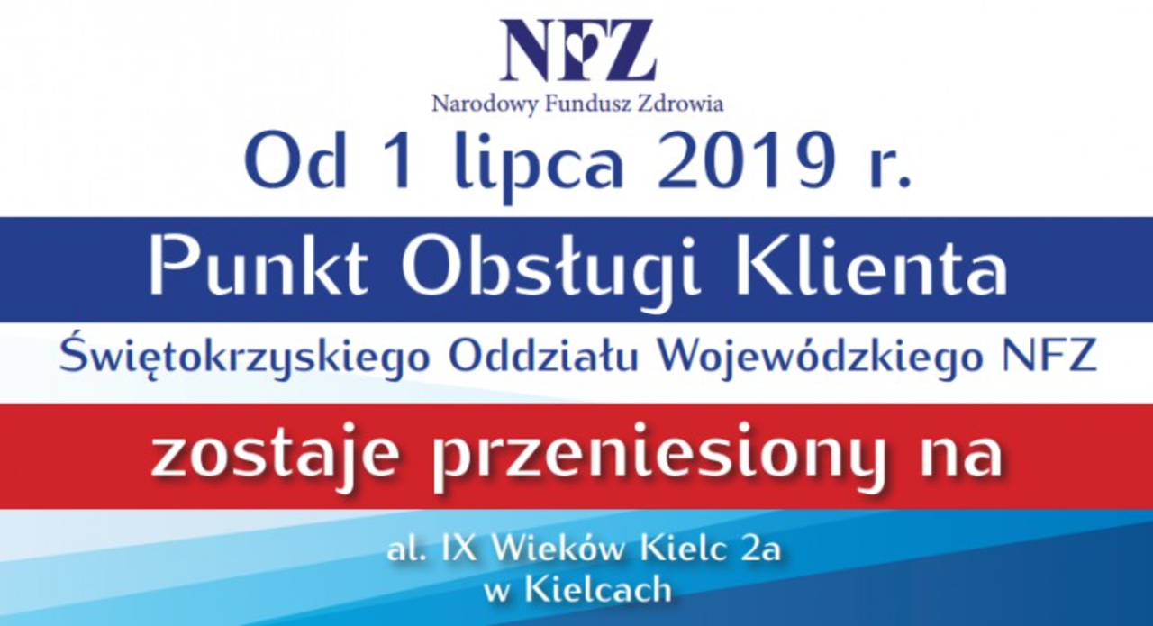 1 lipca przeniesiony zostanie Punkt Obsługi Klienta Świętokrzyskiego Oddziału NFZ w Kielcach, który będzie mieścił się poza siedzibą Funduszu, na al. IX Wieków Kielc 2a.