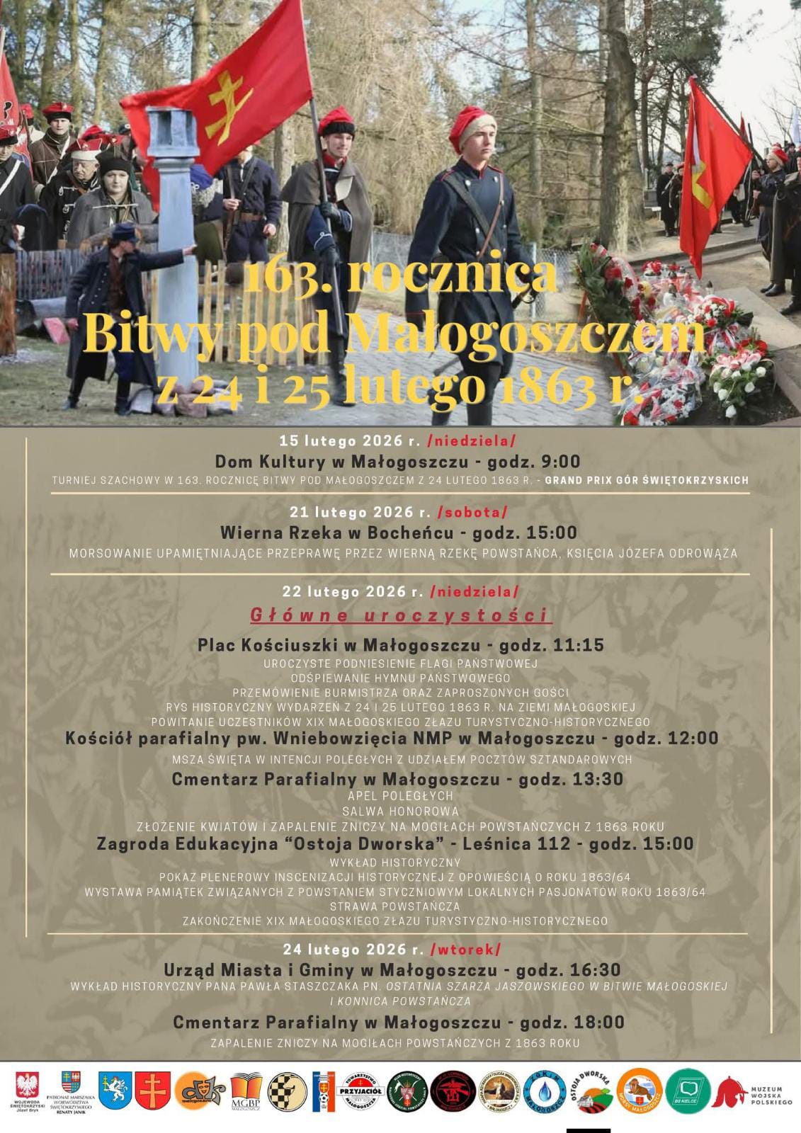Obchody upamiętniają wydarzenia z 24 i 25 lutego 1863 roku. W niedzielę (22 lutego) o godz. 11.15 na Placu Kościuszki w Małogoszczu odbędzie się uroczyste podniesienie flagi państwowej, odśpiewanie hymnu oraz przemówienia burmistrza i zaproszonych gości. Zaplanowano także rys historyczny wydarzeń sprzed 163 lat oraz powitanie uczestników zjazdu.