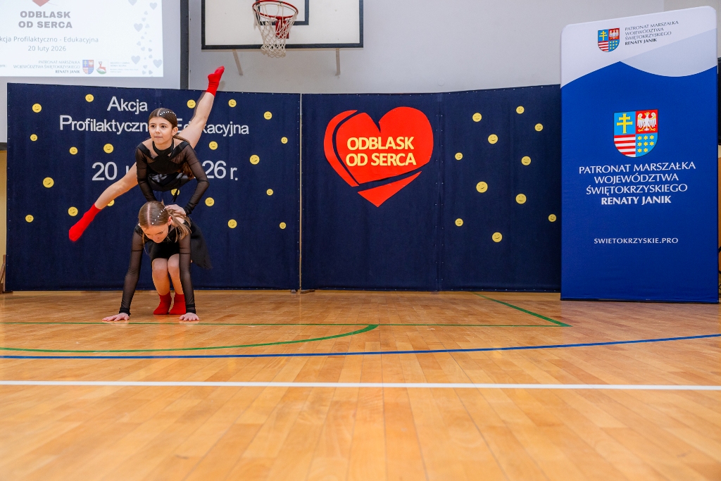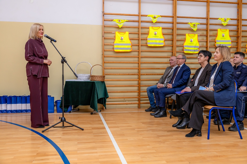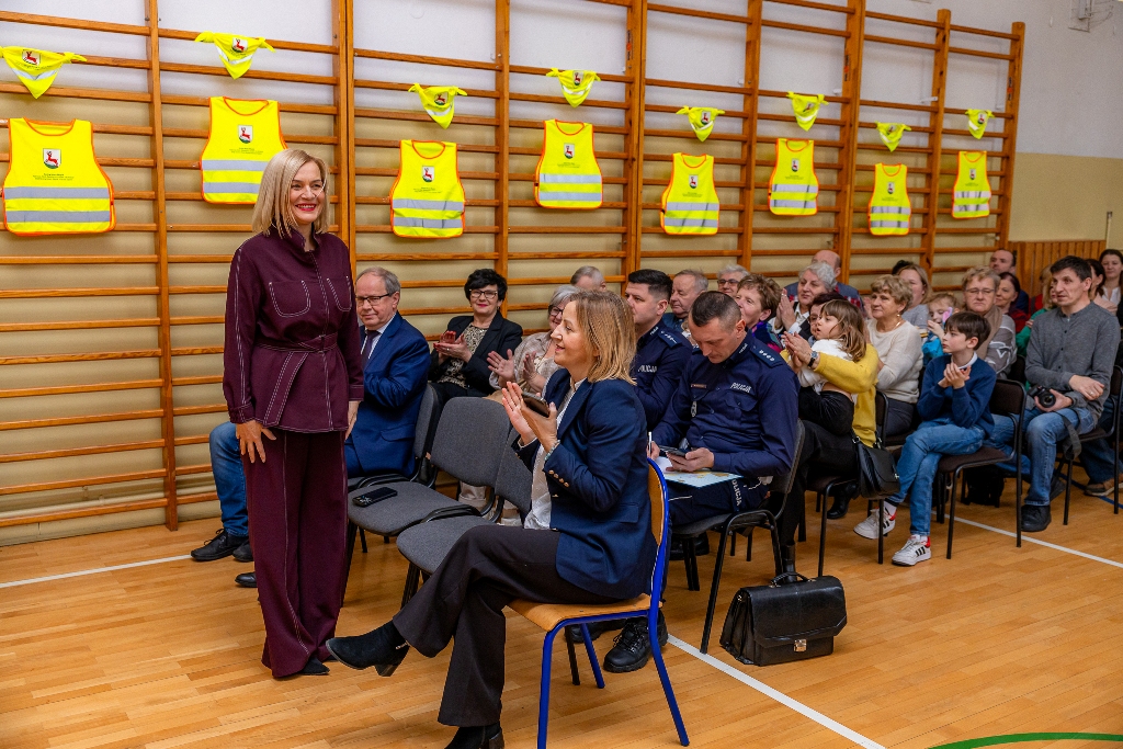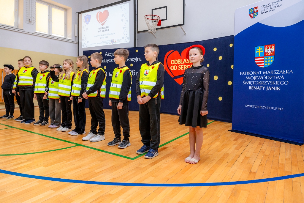Kulminacyjnym momentem było wręczenie odblasków dzieciom oraz seniorom. Przekazali je marszałek województwa oraz funkcjonariusze Policji. Część oficjalną uzupełniły występy artystyczne uczniów. Poprowadziła je uczennica klasy VII Kaja Kończak. Na scenie zaprezentowali się uczniowie klas II i III przygotowani przez Ewę Mazur. Wystąpiły także tancerki zespołu „Magic”. Solowy układ wykonała Wiktoria Góźdź, a duet zaprezentowały Laura Hińcza i Urszula Stączek. Choreografie przygotowała Ewelina Barwicz.