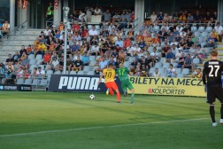 Ponad 7 tysięcy widzów zgromadzonych na Kolporter Arenie nie musiało długo czekać na wyrównującego gola. Już 7 minut później po nieporozumieniu zawodników Śląska, piłka trafiła przed pole karne do Janijcia. Ten mocno uderzył, ale strzał został zablokowany przez Celebana. Sędzia w pierwszym momencie pokazał na rzut rożny, ale po wideoweryfikacji okazało się, że były piłkarz Korony dotknął piłkę ręką. "Jedenastkę" na gola pewnie zamienił Ellia Soriano.