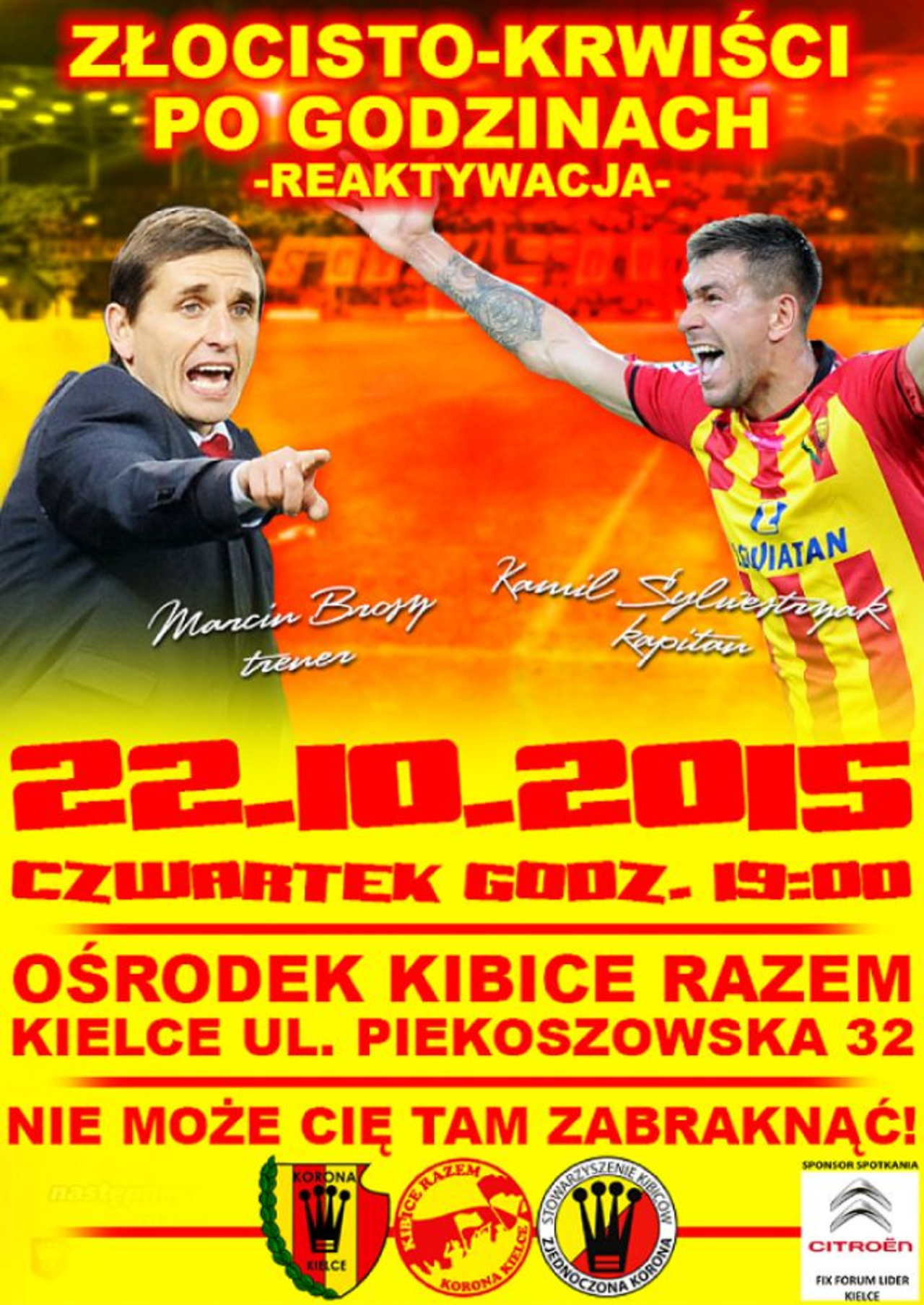 W czwartek, 22 sierpnia w ośrodku „Kibice Razem” przy ulicy Piekoszowskiej odbędzie się kolejna edycja cyklicznych spotkań "Złocisto-Krwiści po godzinach". W pierwszej rozmowie z sympatykami żółto-czerwonych w nowej siedzibie kibiców udział wezmą Marcin Brosz oraz Kamil Sylwestrzak.