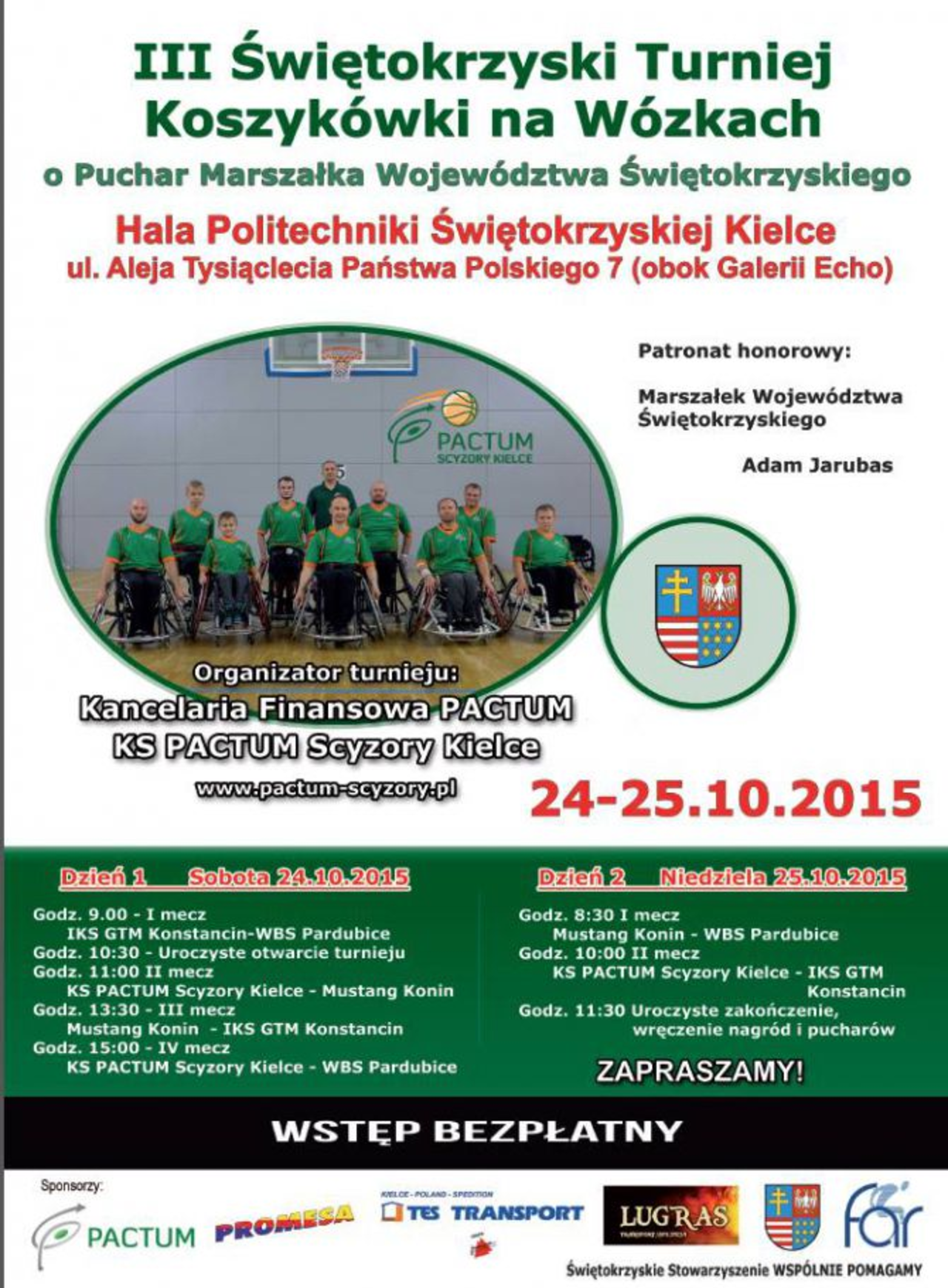 W najbliższy weekend (24-25 października) odbędzie się III Świętokrzyski Turniej Koszykówki na Wózkach o Puchar Marszałka Województwa Świętokrzyskiego. Po raz pierwszy na parkiecie pojawią się drużyny z zagranicy.