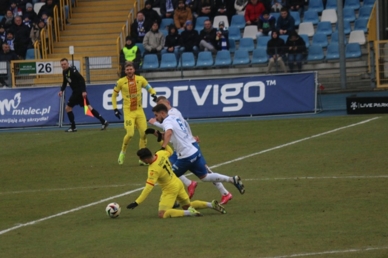 Oba zespoły w tym sezonie mają spore problemy ze zdobywaniem bramek, co potwierdziła pierwsza połowa zakończona bezbramkowym remisem. Kielczanie częściej utrzymywali się przy piłce, natomiast piłkarze Stali Mielec częściej próbowali zaskoczyć Rafała Mamlę strzałami na bramkę. Najgroźniejszą okazję dla Złocisto-Krwistych stworzył Mariusz Fornalczyk – po dobrej wymianie podań z Nono skrzydłowy oddał groźny strzał z pola karnego, niestety niecelny.