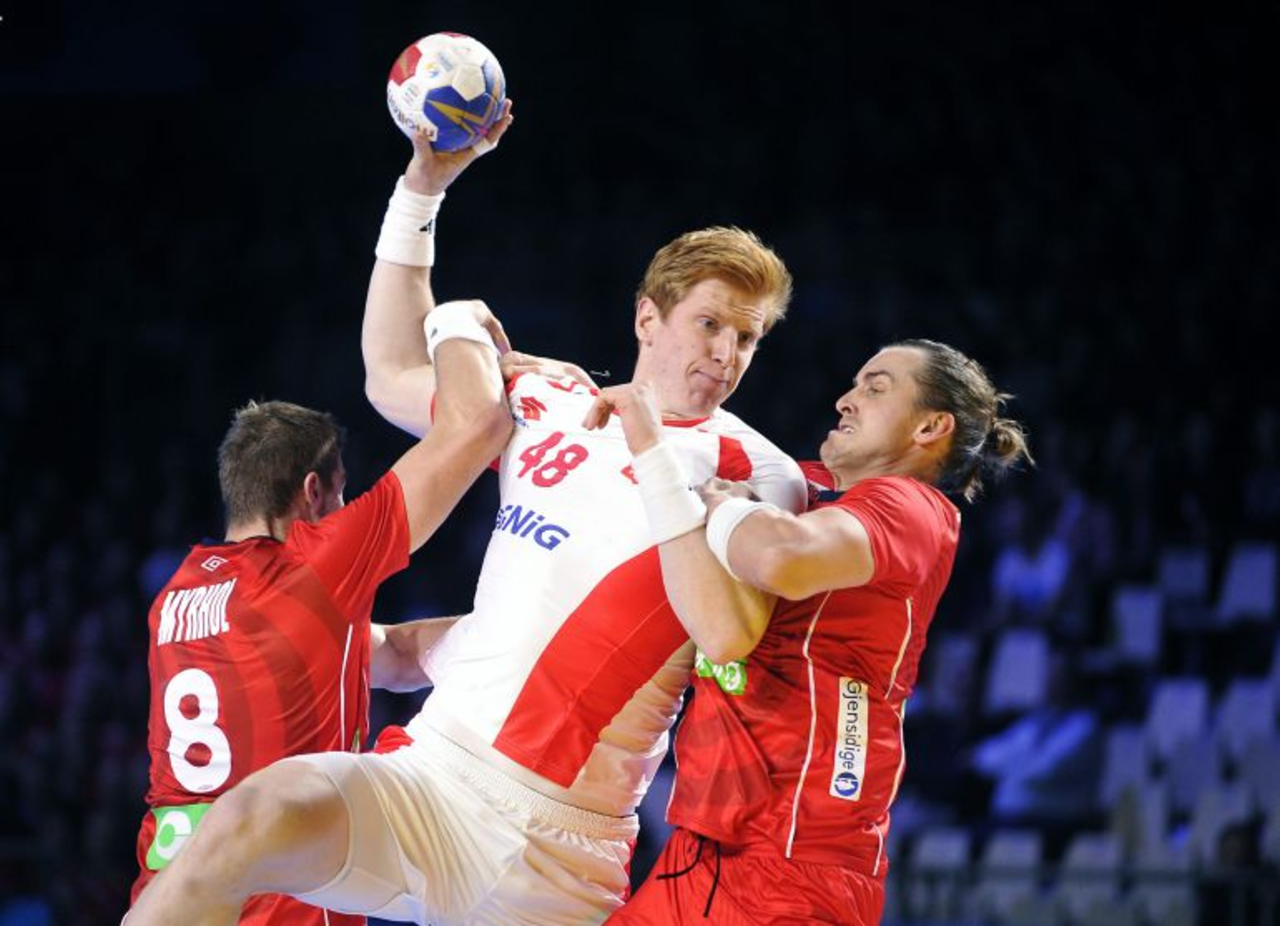 Polacy starcie z faworyzowaną Norwegią rozpoczęli bardzo dobrze. Świetnie w spotkanie wprowadził się golkiper Adam Malcher, a w ataku od początku „bomby” na bramkę rywali słał Tomasz Gębala. W kolejnych fragmentach drużyna Christiana Berge powoli zaczęła łapać swój rytm. „Biało-czerwoni” zaczęli za to często tracić piłkę przy rozgrywaniu, na ich szczęście dużo własnych błędów notowali również przeciwnicy. W ostatnich minutach pierwszej części w bramce Norwegii pojawił się Espen Christensen, który kilka razy odbił rzuty naszych zawodników, a jego koledzy z pola zdołali wypracować dwubramkową przewagę i do szatni zeszli prowadząc 12:10.
