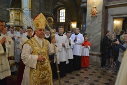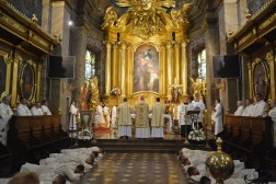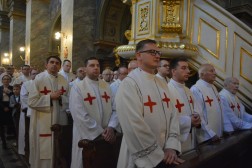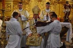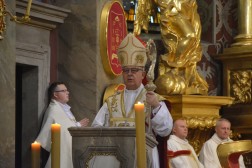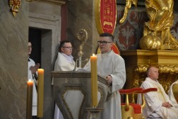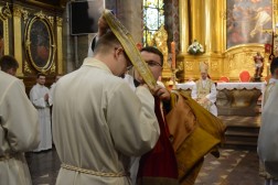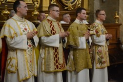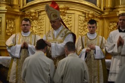 Najświętszej Ofierze przewodniczył biskup kielecki, a koncelebrowało ją kilkunastu kapłanów. W swojej homilii biskup Jan Piotrowski zwrócił się do nowych diakonów. – Pamiętajcie, że dla tych, którzy zostawiają sieci i łódź swoich ludzkich przywiązań, aby podążać za Chrystusem, Pan Jezus nie tylko obiecuje, ale daje radość nowego życia, która napełnia serce i ożywia pielgrzymowanie. Nigdy nie ulegajcie obojętności łasce miłosierdzia i zawsze tęsknijcie za tym, co czyste, dobre i szlachetne. Mimo grzechu, który gdzieś pełza w Kościele i wśród ludzi Kościoła, nie brakuje świętości, bo przecież błogosławionym jest proboszcz tej katedry, męczennik z Dachau, ks. Józef Pawłowski. To pełne świętości oddane życie tych kapłanów, którzy zostali zesłani na Sybir, cierpieli w stalinowskich obozach i tych, którzy dziś cierpią z różnych powodów. Dlatego pełni wiary nabierzcie odwagi do powierzonej wam misji. Jest z wami modlący się Kościół kielecki, wasi bliscy, rodzice, rodzeństwo, przyjaciele i seminaryjna wspólnota. W głębi serca, za świetym Piotrem, jako własne zawierzenie się Chrystusowi powtórzcie w pełnym zaufaniu: „Panie, do kogo pójdziemy? Ty masz słowa życia wiecznego, a my uwierzyliśmy, że Ty jesteś Świętym Bożym” – mówił pasterz diecezji kieleckiej.