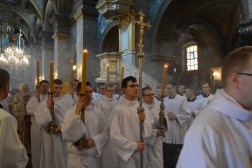 Po konferencji odbyło się wystawienie Najświętszego Sakramentu, po którym rozpoczęła się Msza Święta. Przewodniczył jej biskup Jan Piotrowski, a koncelebrowali biskupi pomocniczy naszej diecezji oraz licznie zgromadzeni kapłani. W swojej homilii pasterz diecezji kieleckiej zwrócił uwagę na ogromne znaczenie formacji kapłańskiej i wierności podczas posługi. Przedstawił również przykład bł. ks. Józefa Pawłowskiego, męczennika i proboszcza katedry kieleckiej, jako wzór do naśladowania. – To niezwykle dynamiczny kapłan w różnych formach ówczesnego duszpasterstwa, oddany animator misyjny, jałmużnik i społecznik. Charakterystycznym rysem swojej duchowości uczynił miłosierdzie. Taki też pozostał do swojej męczeńskiej śmierci w Dachau w 1942 roku – przypomniał biskup kielecki i dodał, że podstawą kapłaństwa jest gotowość do ofiary, która rodzi się z prawdy i świętości.