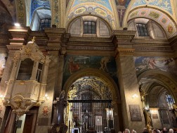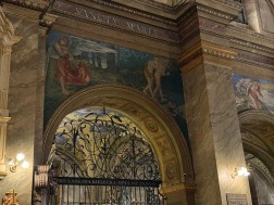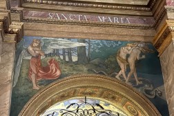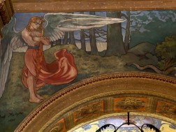 – Malowidło powstało w 1897 roku. Możemy oglądać je w nawie głównej nad jedną z arkad po stronie południowej. Jest to przepiękne przedstawienie – piękna scena, piękna kompozycja. Archanioł, który strzeże bramy do raju, ma bardzo smutną postawę – opuszczoną głowę. Widać smutek na jego twarzy, jakby nie chciał patrzeć na scenę wypędzenia pierwszych rodziców z raju. Jednocześnie przytula do siebie ognisty miecz, jakby nie chciał wyrządzić nim żadnej krzywdy. Ważną postacią tej sceny jest Ewa, która odwraca głowę w kierunku utraconego raju – z nadzieją, że być może nie wszystko jest jeszcze stracone – opisywał ks. Paweł Tkaczyk.