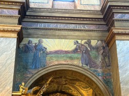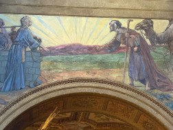 – Na malowidle w kieleckiej katedrze Rebeka została przedstawiona przy studni, po lewej stronie kompozycji. Na drugim planie stoi inna kobieta z dzbanami na ramionach. Po przeciwnej stronie, w geście powitania, ukazano Eliezera, który – wraz z pomocnikiem i tylko jednym wielbłądem – dopiero co dotarł do studni. W centrum kompozycji widać promienie zachodzącego za horyzontem słońca. Nie jest to bardzo szczegółowa ilustracja tekstu biblijnego, jednak taka kompozycja wprowadza dynamizm do całej sceny i – zgodnie z egzegezą chrześcijańską – pozwala w postaci Eliezera widzieć typ archanioła Gabriela, który w przyszłości przyjdzie do Maryi w chwili Zwiastowania – wyjaśnia ks. Tkaczyk.